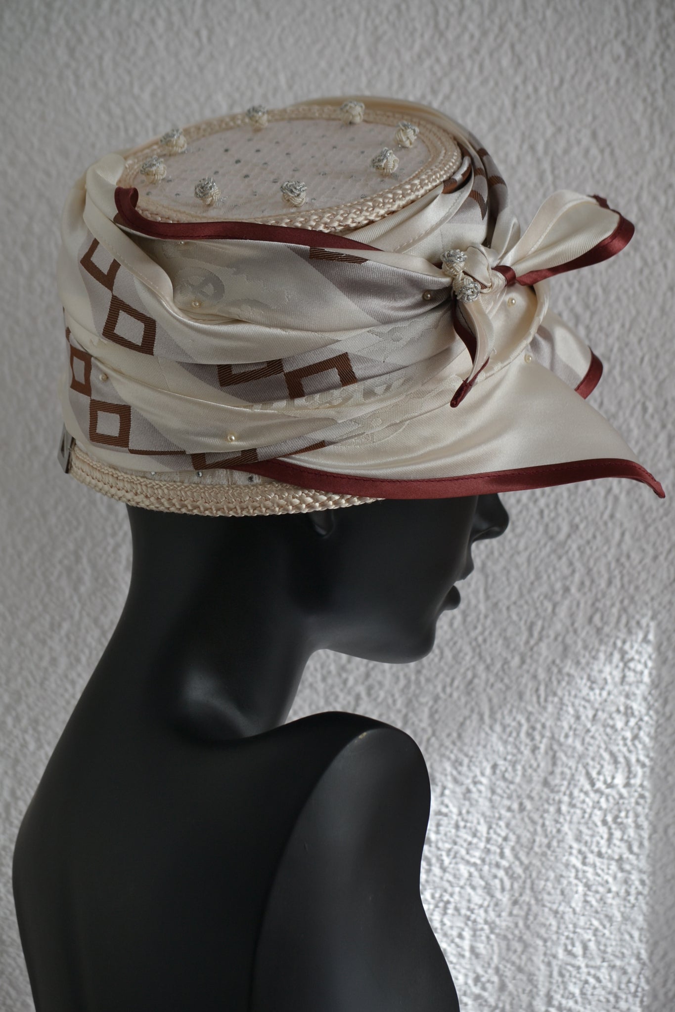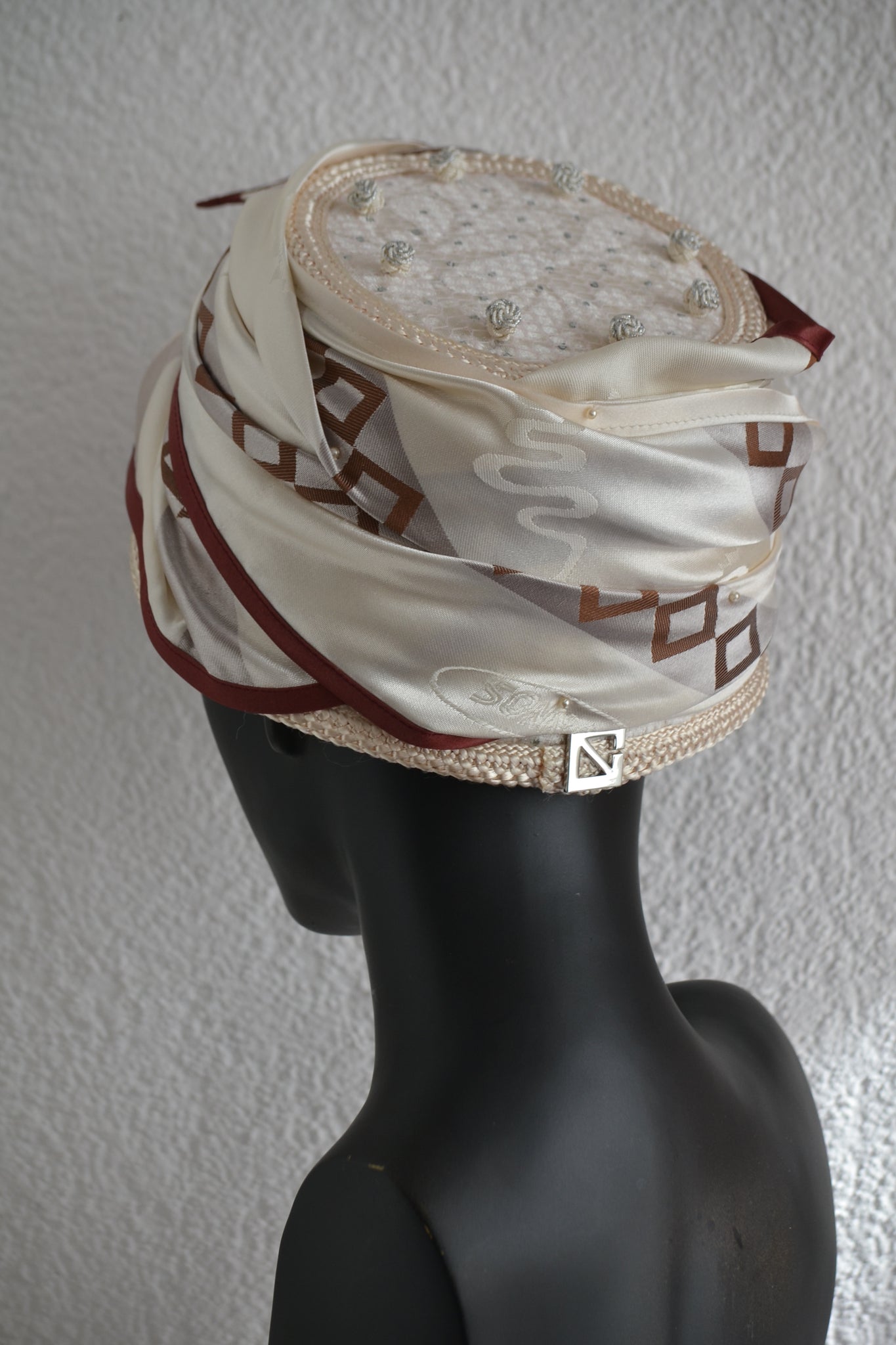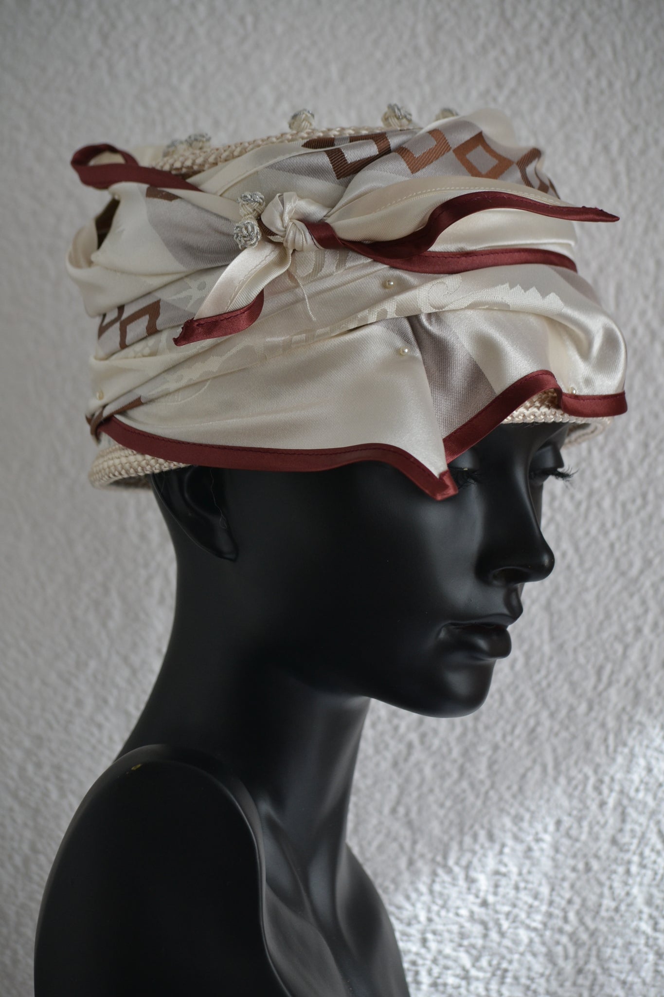 • Materials used: This elegant cloche hat is crafted from cream white African-style satin fabric with a refined geometric print. It features an aubergine satin ribbon, white Arabic buttons, and panels of cream white velvet studded fabric that add texture and luminosity. The hat comes as a coordinated set with a matching scarf, crafted from the same cream white satin fabric, completed with a delicate beaded jewel to hold the scarf gracefully in place.
