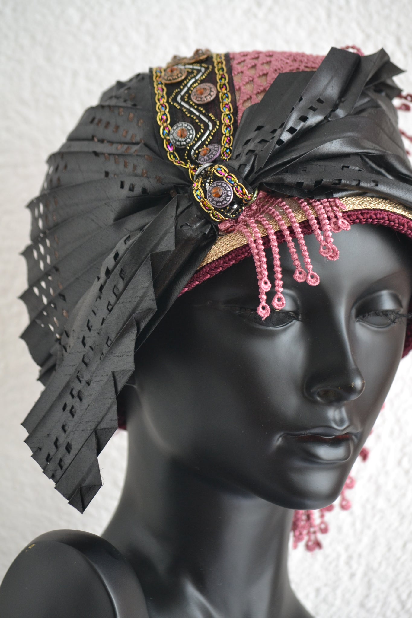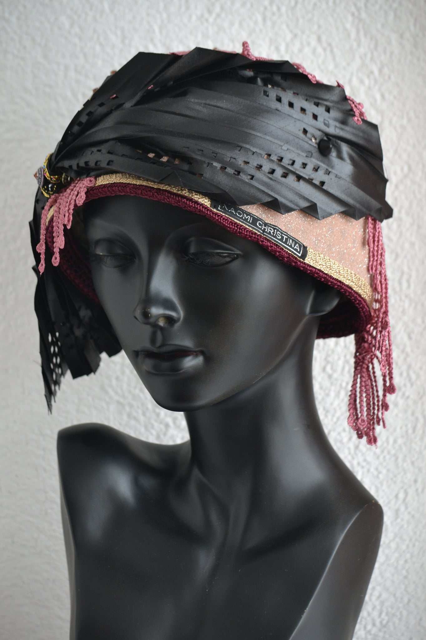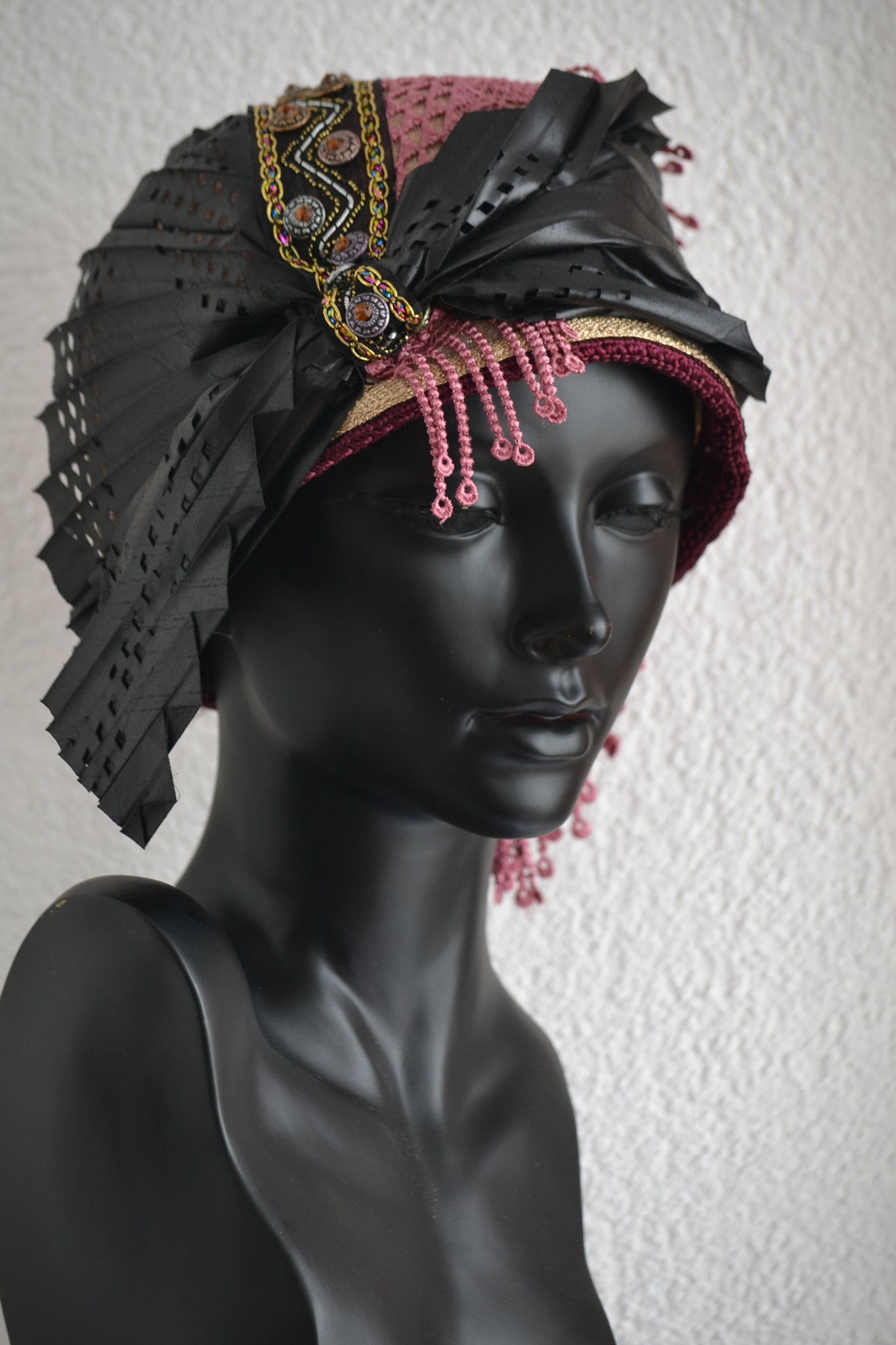• Materials used: This bold cloche hat is crafted from soft black nubuck fabric and richly detailed with layers of cultural and textural contrast. It features black and grey printed jacquard, double African fabric known as Duku, and red and black African print fabric. The hat is elegantly aligned with black woven vegan leather and embellished with a mix of black, grey, and white buttons, creating a powerful and stylish composition.
