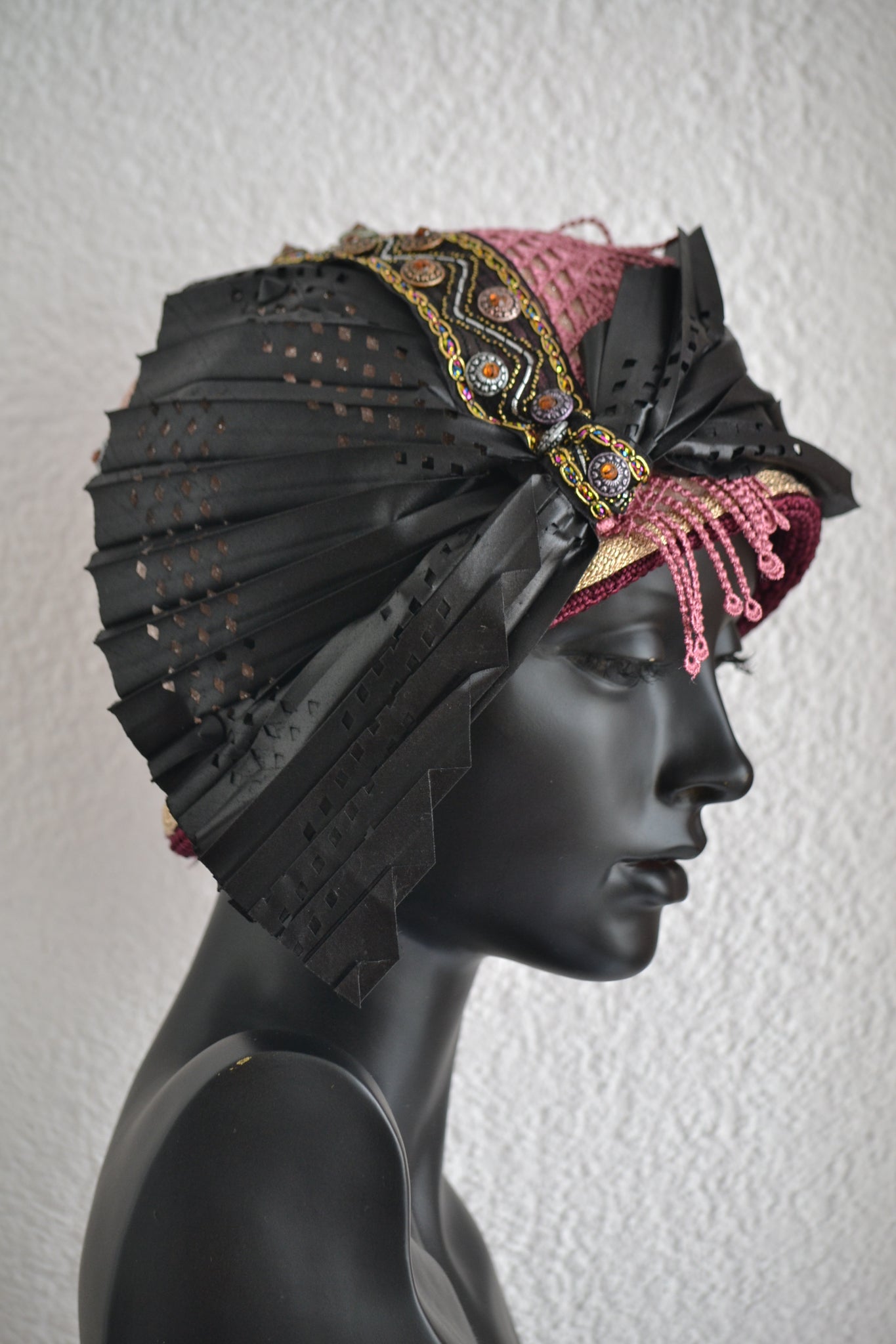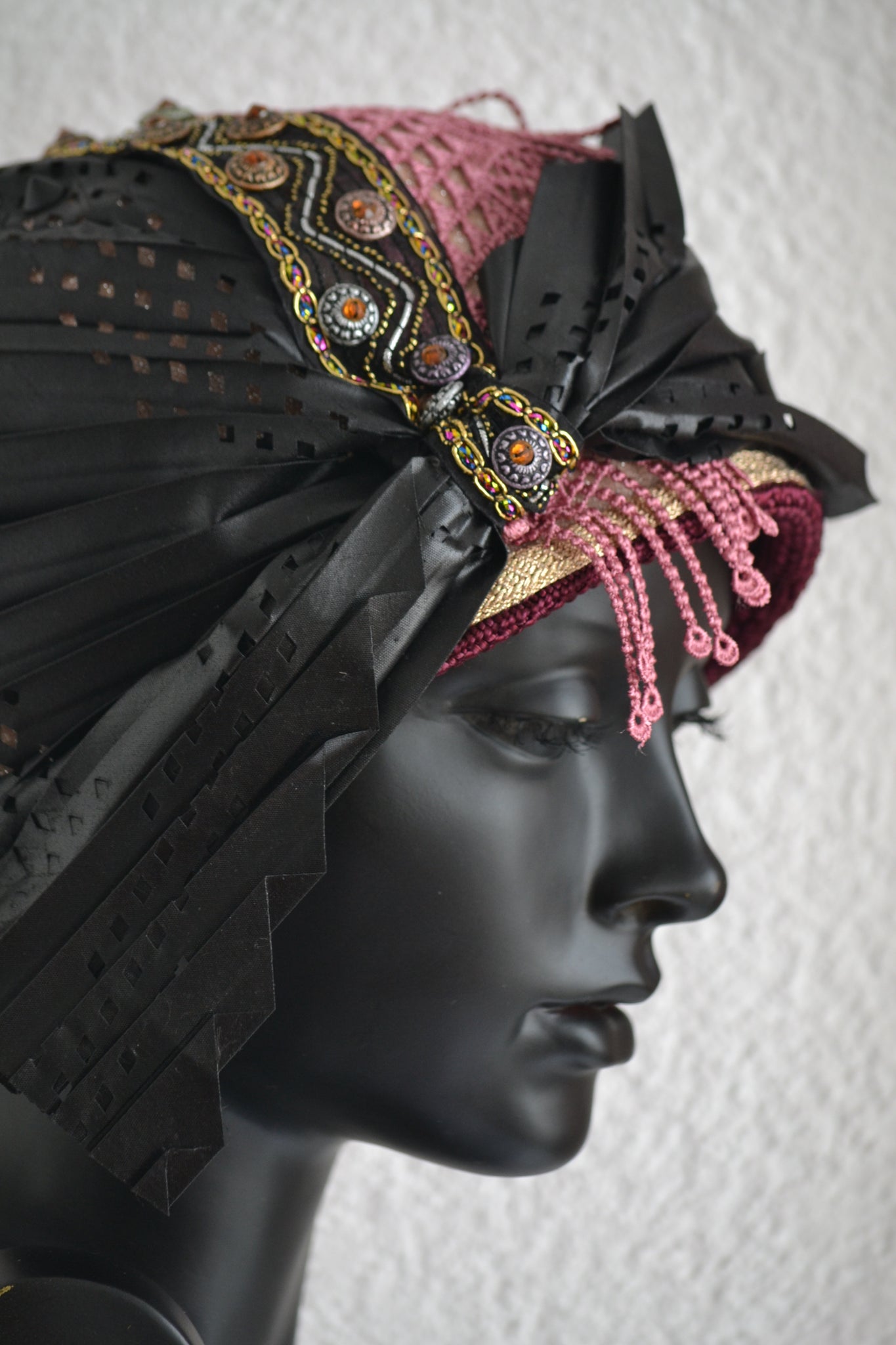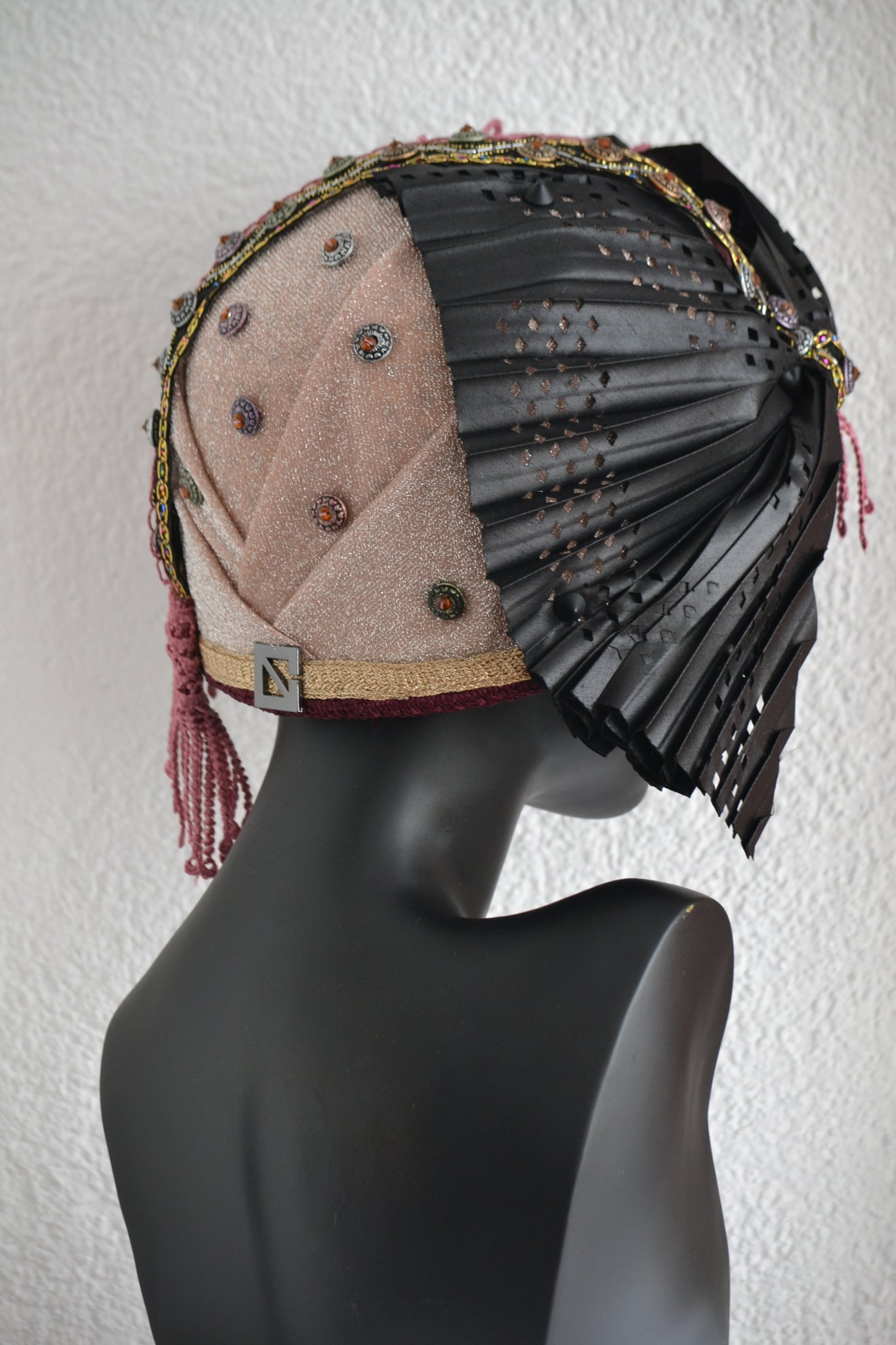 • Materials used: This bold cloche hat is crafted from soft black nubuck fabric and richly detailed with layers of cultural and textural contrast. It features black and grey printed jacquard, double African fabric known as Duku, and red and black African print fabric. The hat is elegantly aligned with black woven vegan leather and embellished with a mix of black, grey, and white buttons, creating a powerful and stylish composition.
