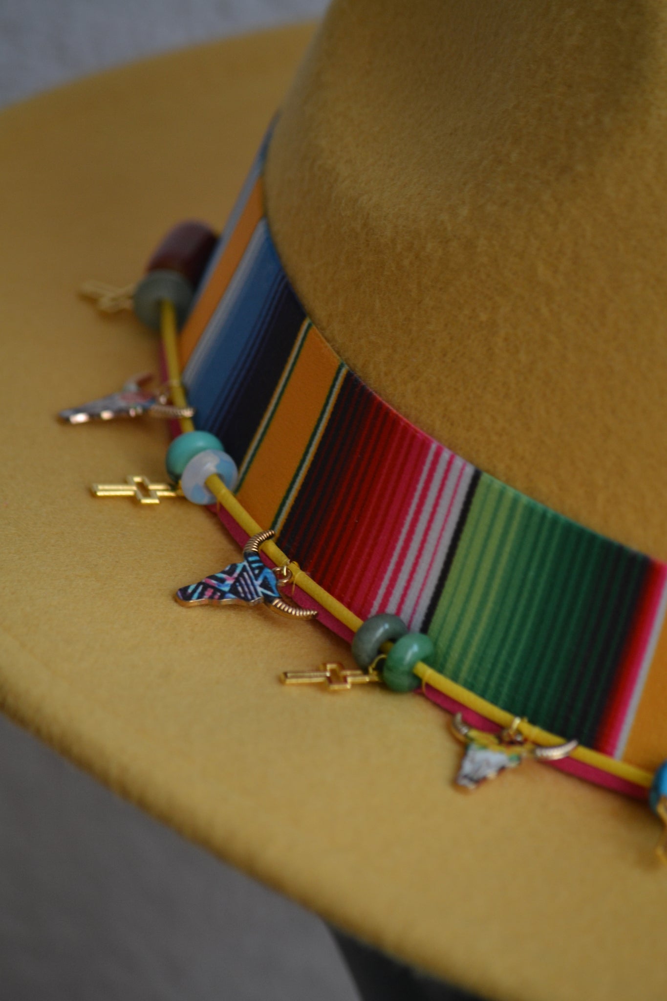 Materials used: This vibrant fedora is crafted from yellow polyester, providing a soft and structured base. It is adorned with a colorful Mexican print striped ribbon, enamel gold metal cow skull charms, cross-shaped charms, and an array of colorful beads, combining playful energy with refined detail for a lively, statement-making accessory.