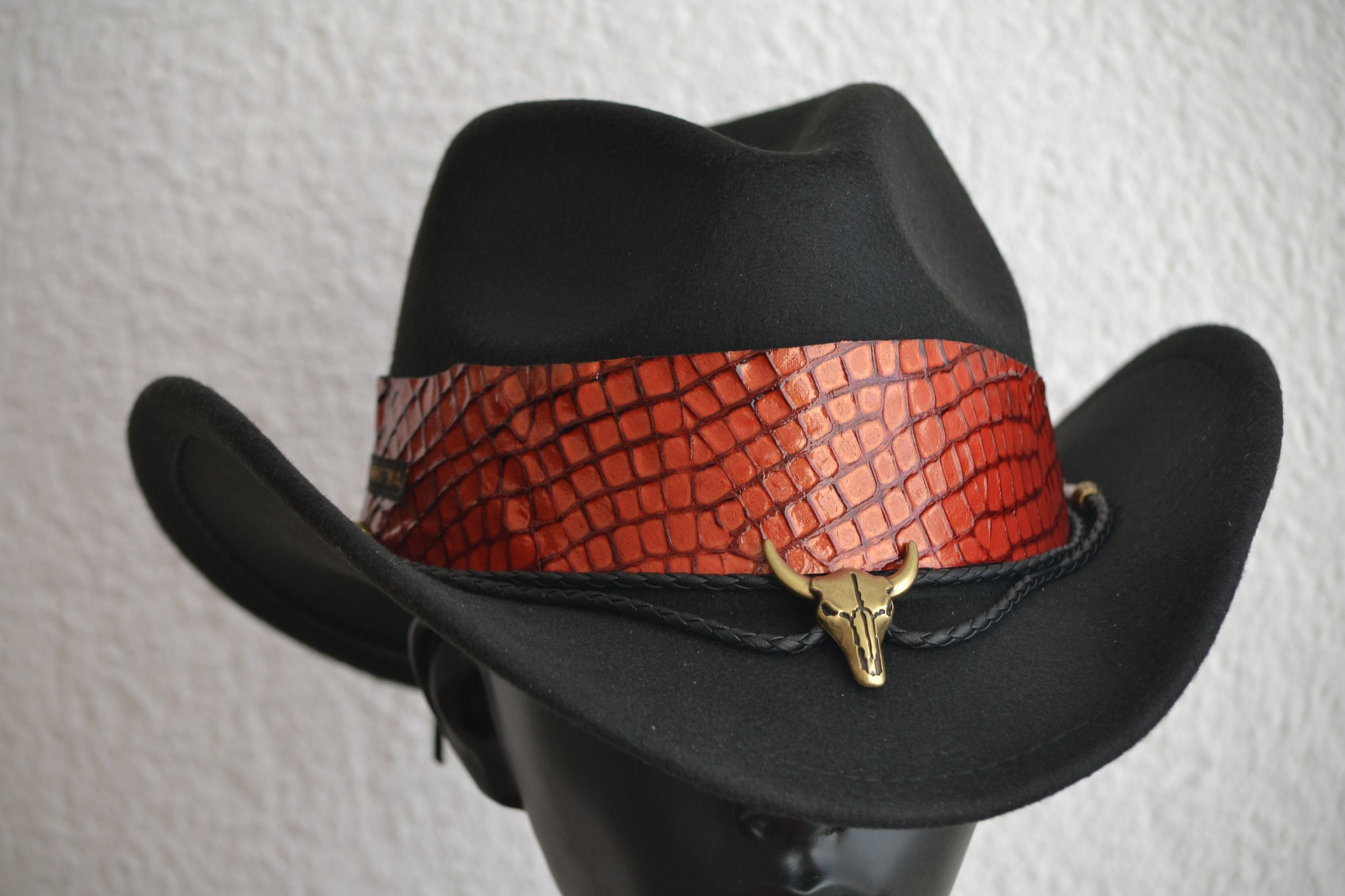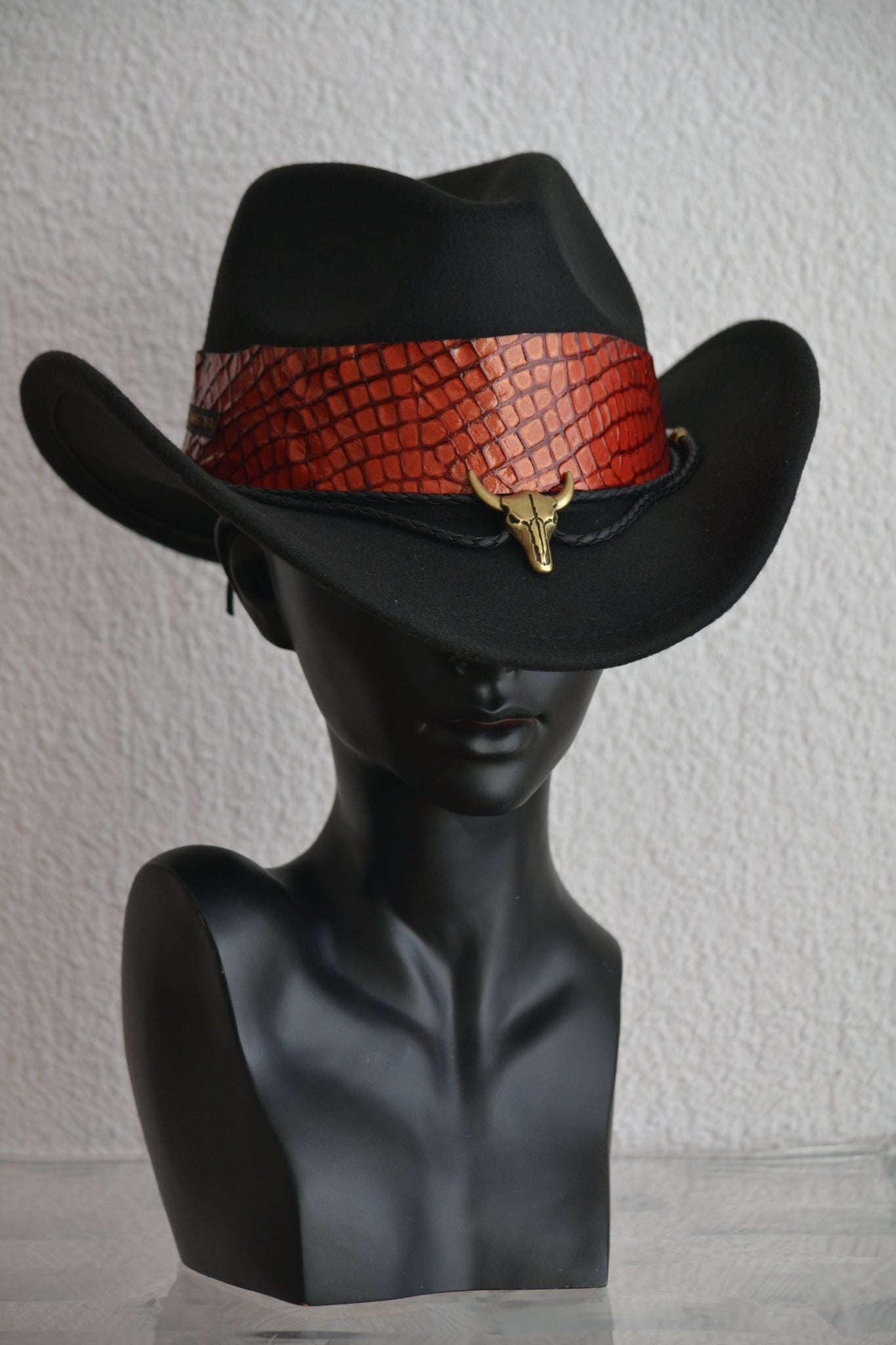 • Materials used: This bold rounded cowboy-style fedora is crafted from black polyester, offering a smooth and structured base. It features a red-gold animal-embossed genuine leather hand-cut ribbon, black metal studs, a bronze cow skull, and a braided vegan leather cord, creating a striking, edgy, and western-inspired look.