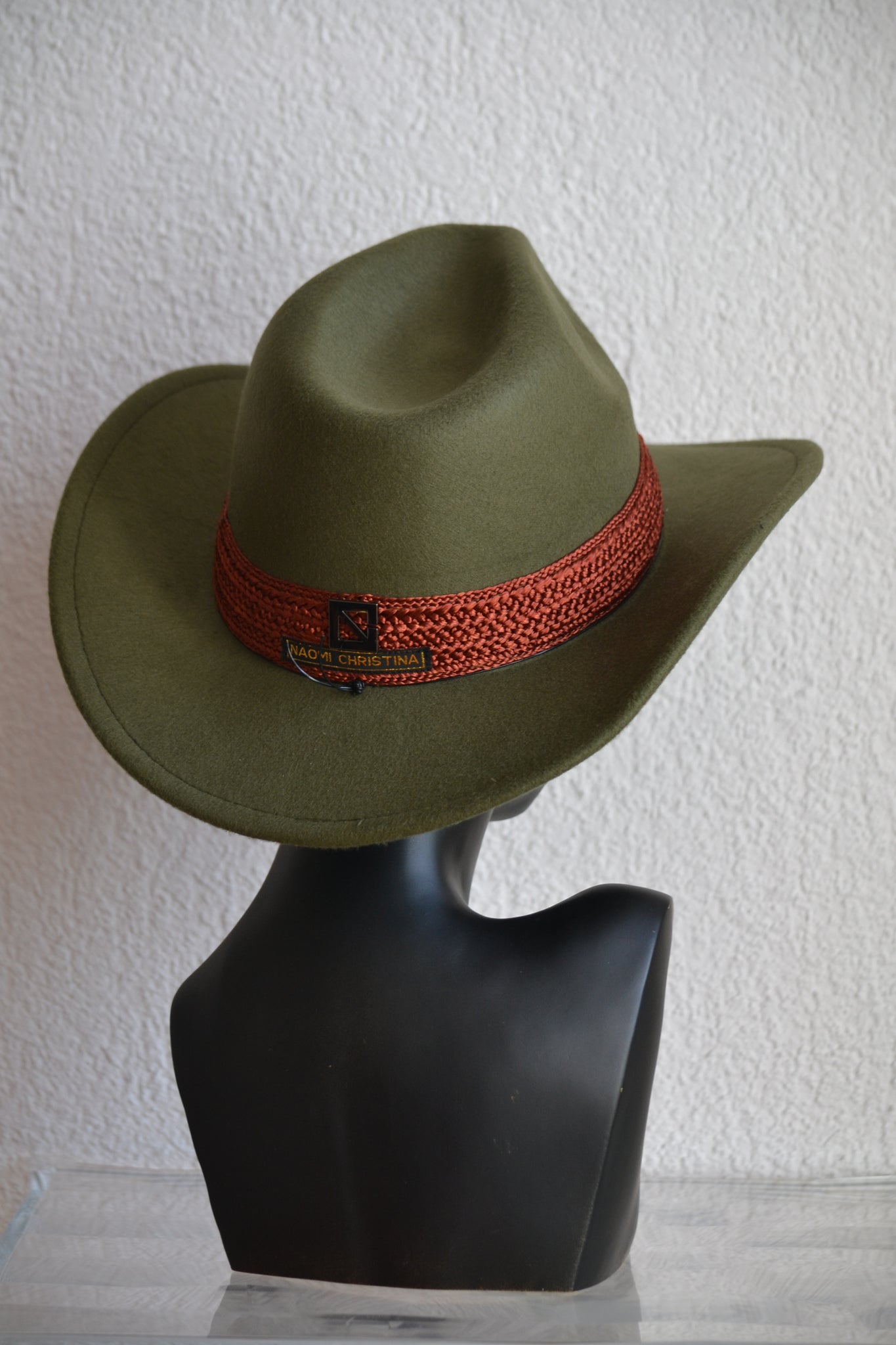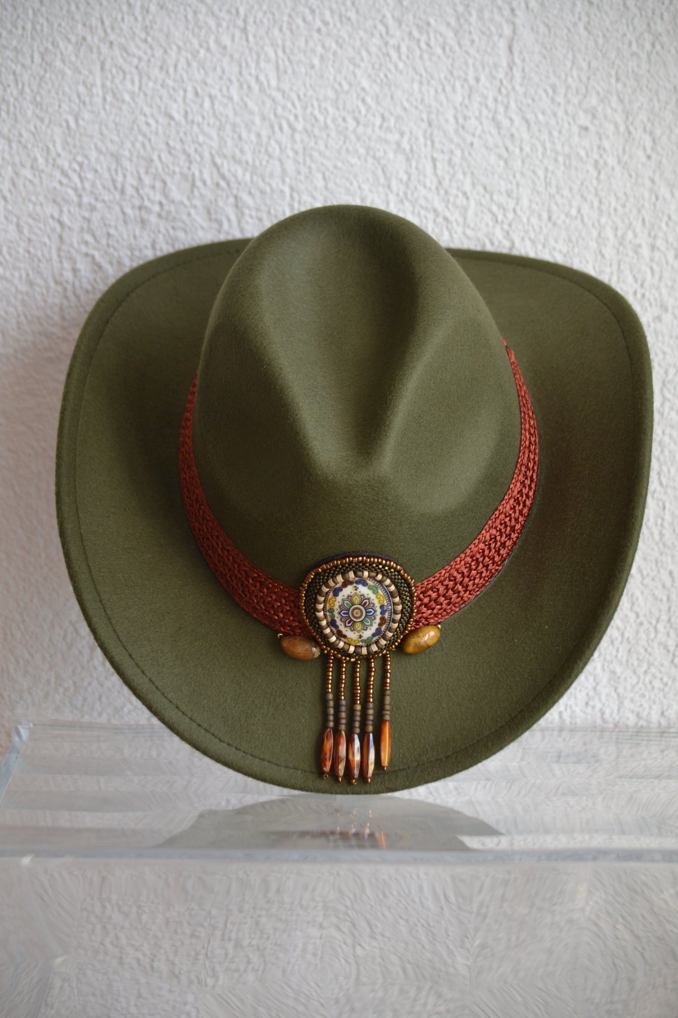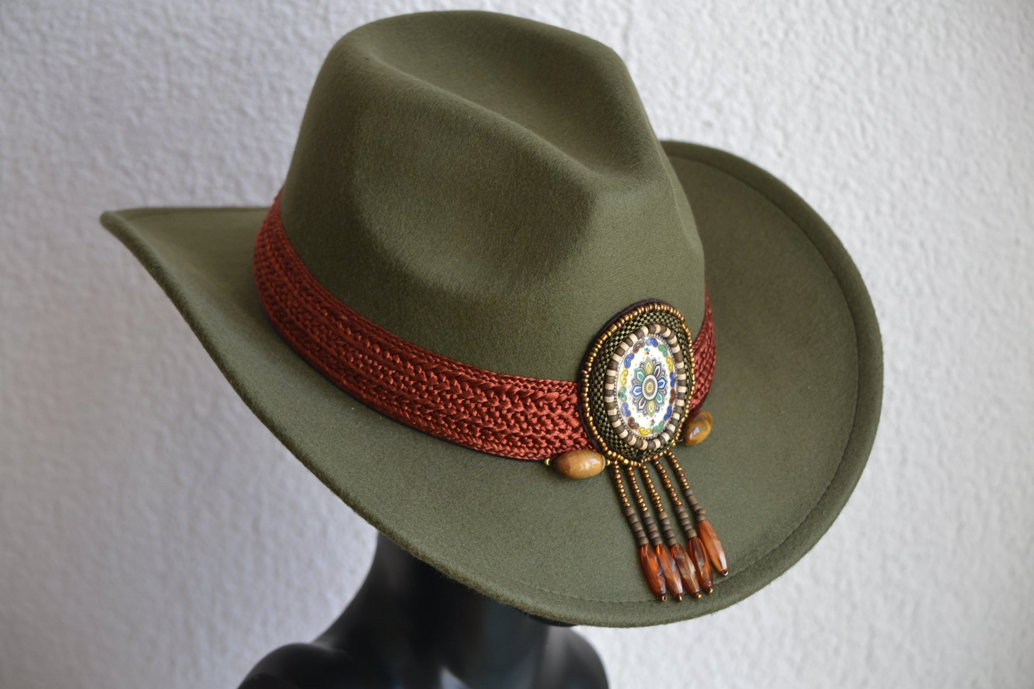 • Materials used: This bold cowboy-style fedora is crafted from olive green polyester, offering a structured and comfortable base. It features a brown lace ribbon, an oval beaded Indian-style applique, beaded tassels, a black leather cord, and two natural ceramic beads, combining earthy tones and rich textures for a striking, culturally inspired design.